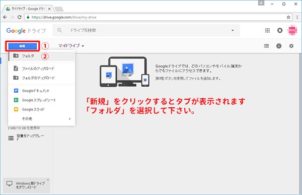 画面の「新規」①をクリックしてから「フォルダ」を選択します。